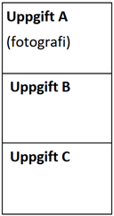 Sammanställ uppgifterna A, B och C (sammanlagt tre bilder) i en pdf-fil med tre sidor. Det är tillåtet att redigera bilderna digitalt. Upplösningen på den färdiga bilden ska vara ungefär 300 dpi, dock högst 600 dpi.